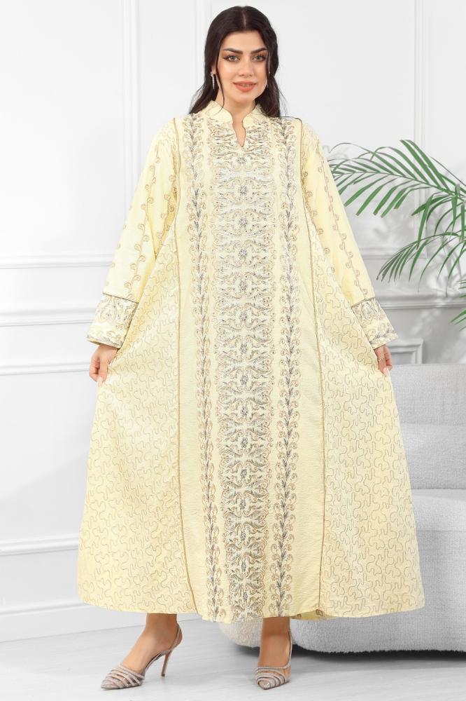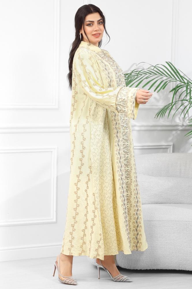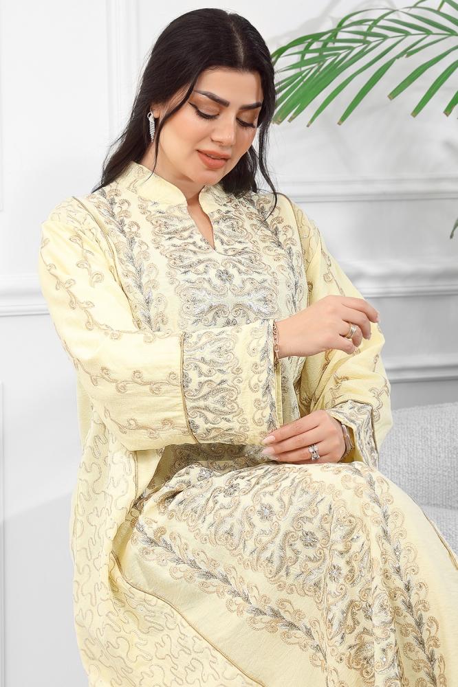 جلابية مُطرّزة بتفاصيل بارزة وتطريز كامل بيج