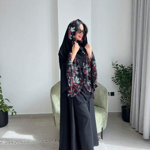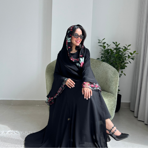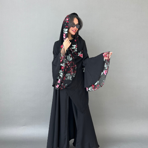 عباية انترنت سوداء الأكمام فرنسية مع تل مطرزة بالورد الأحمر