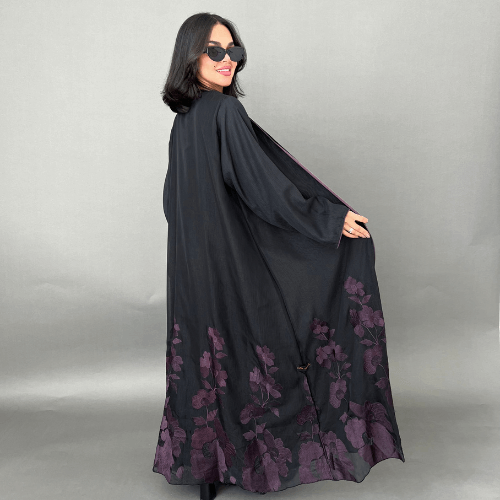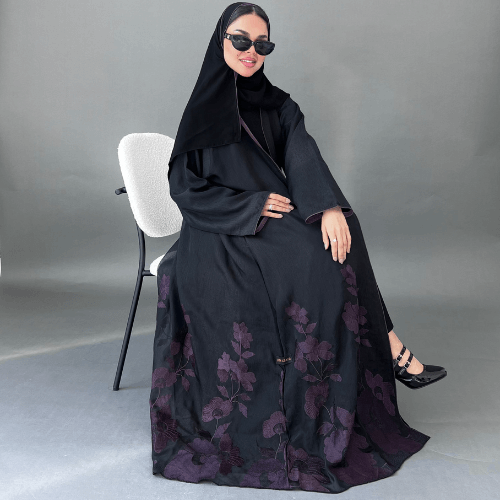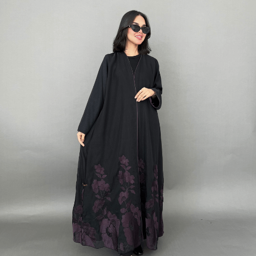 عباية كريب فاخر بتطريز موف أنيق من الأسفل